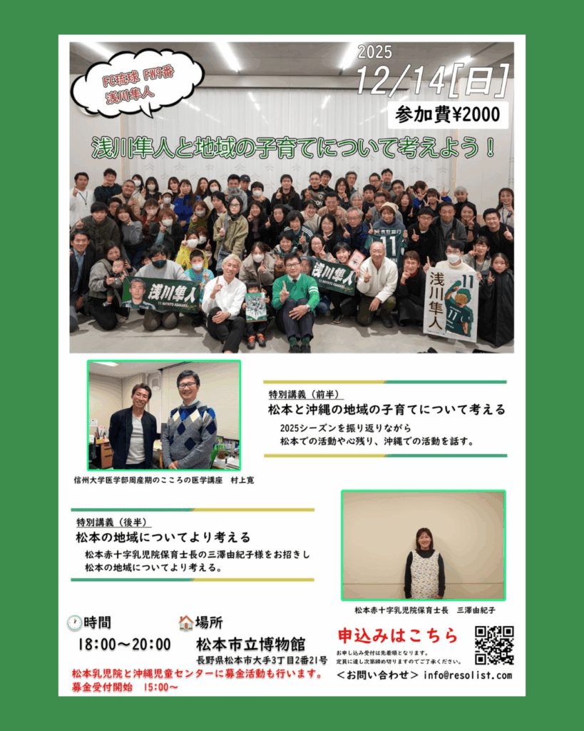 お知らせ 12月14日(日)浅川隼人選手と特別講演を行います!!! Editor 2025年12月10日 皆様にお知らせです。 12月14日(日)浅川隼人選手と一緒に「地域の子育てについて考えよう」の特別講演を開催いたします!! 前半は2025年シーズンの振り返りを行い、松本や沖縄での子育てについてお話しながら、後半は特別講師をお迎えし松本地域の子育てについてより深くお話ししていければと思います。 講演会に参加できない方でも、15時~募金活動も行いますので是非足をお運びください。 よろしくお願いいたします。