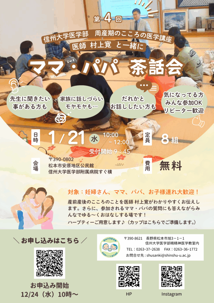 各種イベント・講演会 第2回 ミニ「さよなら、産後うつ」講演&お茶会 を開催します! 2025年4月21日 Editor https://shinshu-shusanki.org/shusanki2022/wp-content/uploads/2022/09/ロゴA-アイコン用.png 周産期のこころの医学講座