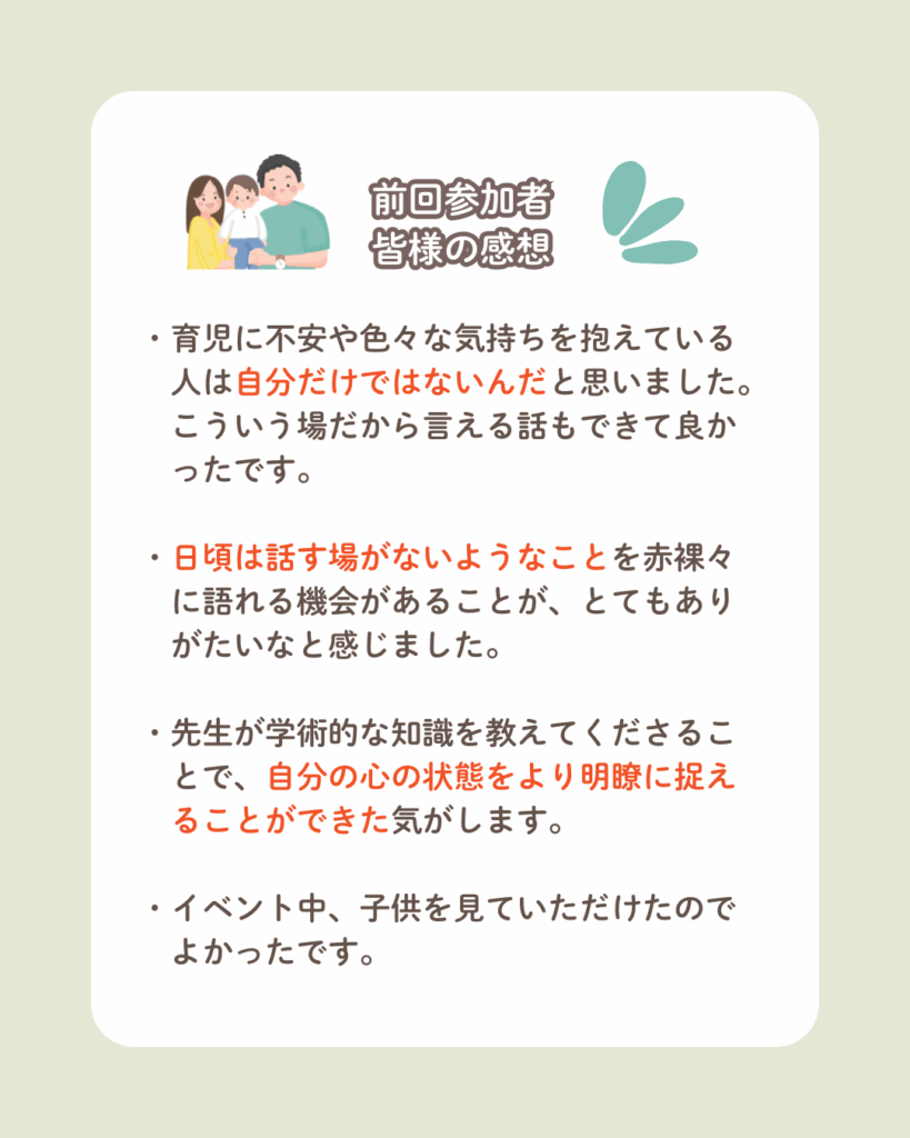 お知らせ 第4回 ママ・パパ 茶話会開催いたします! Editor 2025年12月22日 来年1月21日(水)10:00~ 第4回 ママ・パパ茶話会 開催いたします!是非お気軽にご参加ください。 お申し込みは12月24日(水) 10:00~です。 お申し込みはこちら:https://docs.google.com/forms/d/e/1FAIpQLSeEsaiPluEzlZL58MoQdxKuSgdEOF2k-n1zLywhXTnxaZfbTQ/viewform?usp=header